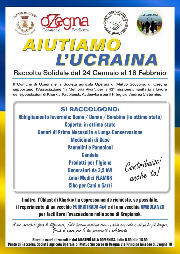 raccolta solidale per la popolazione ucrania organizzata dall’associazione “La Memoria Viva”, che il Comune di Ozegna e la Società Agricola Operaia di Mutuo Soccorso di Ozegna stanno supportando