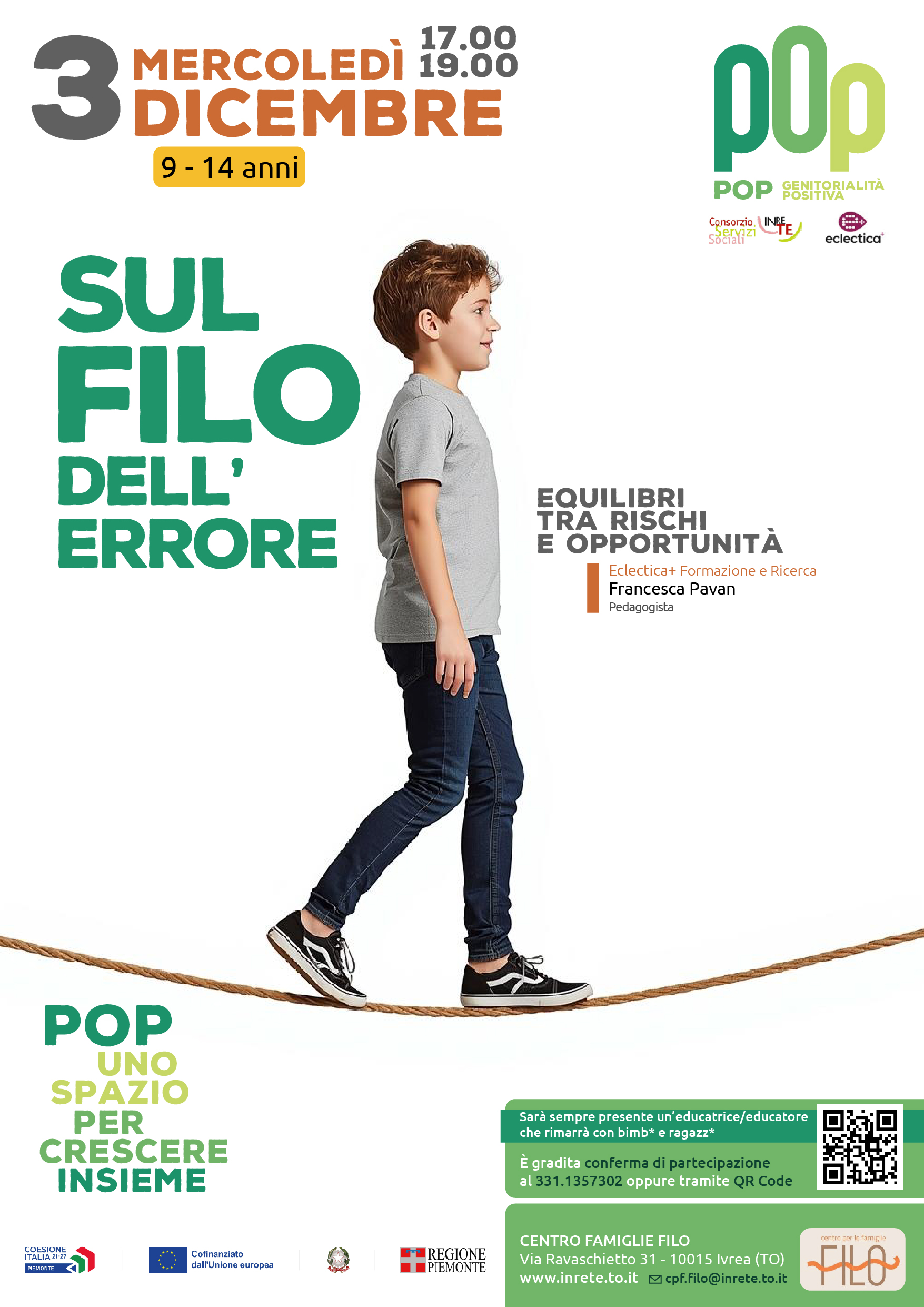 Mercoledì 3 dicembre dalle 17 alle 19 "Sul filo dell'errore. Equilibri tra rischi e opportunità" (per genitori con figli 9-14 anni);