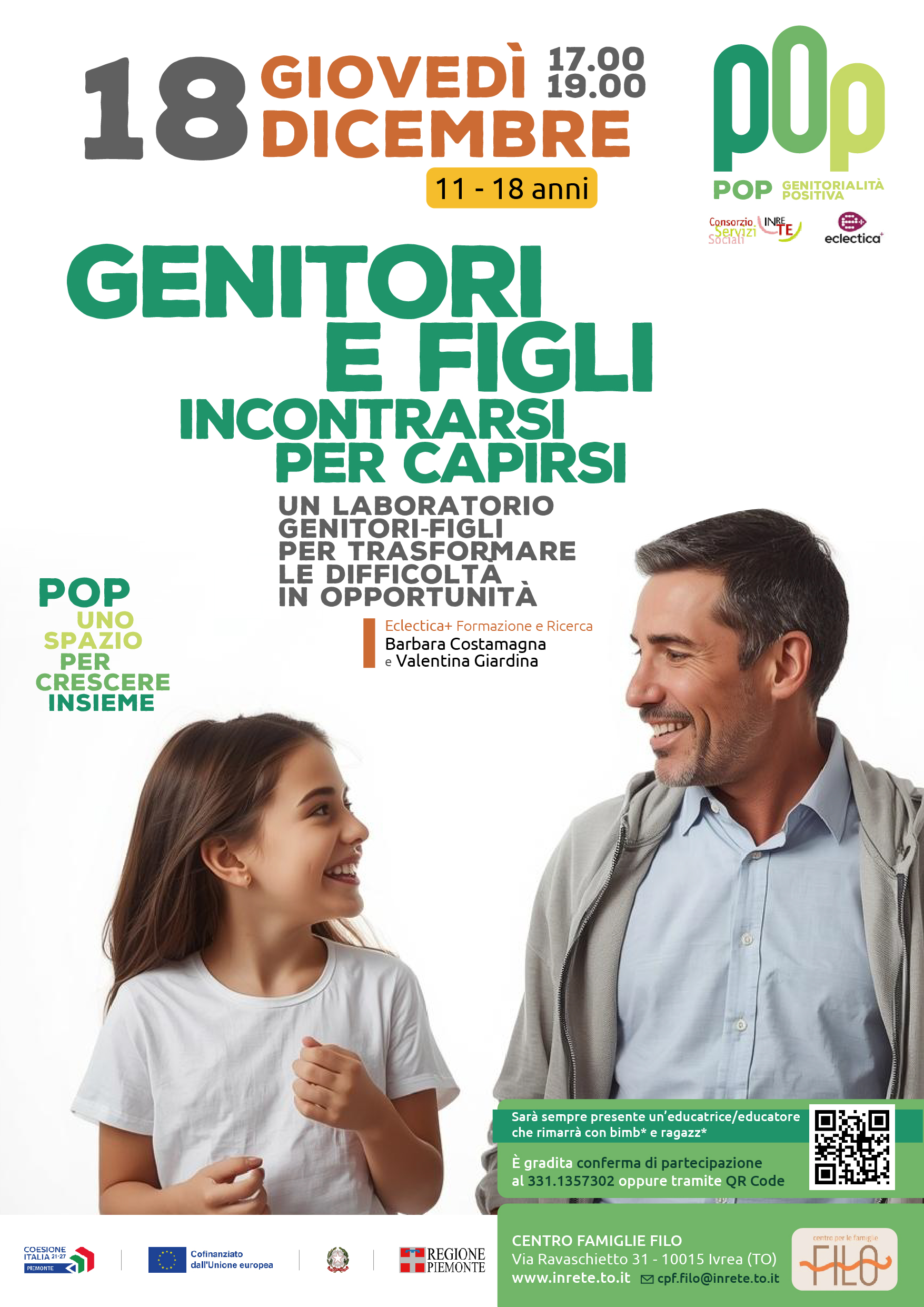 giovedì 18 dicembre "Genitori e figli. Incontrarsi per capirsi. Un laboratorio genitori-figli per trasformare le difficoltà in opportunità" (per genitori con figli 11-18 anni).