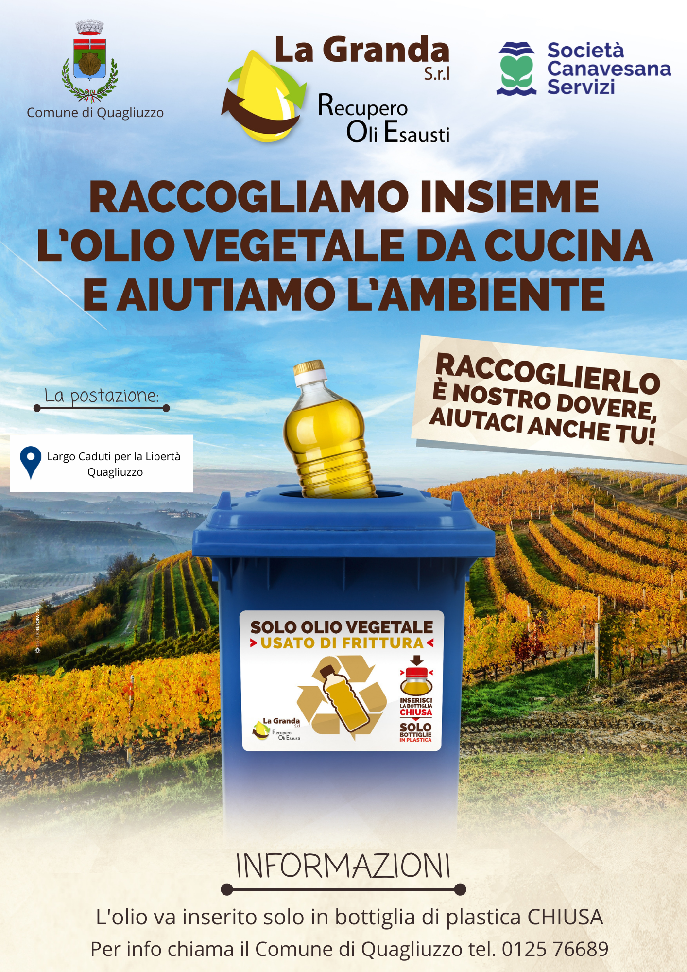 E' possibile conferire gli oli vegetali esausti nell'apposito contenitore posto nell'isola ecologica presso il campo sportivo di Quagliuzzo